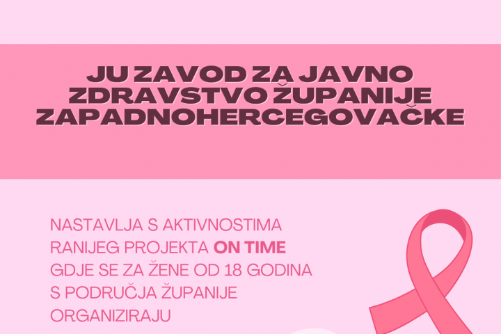 Javna ustanova Zavod za javno zdravstvo Županije Zapadnohercegovačke nastavlja s aktivnostima ranijeg projekta ON-TIME, gdje se za žene od 18 godine života s područja županije organiziraju besplatni ultrazvučni pregledi kao prevencija raka dojke.